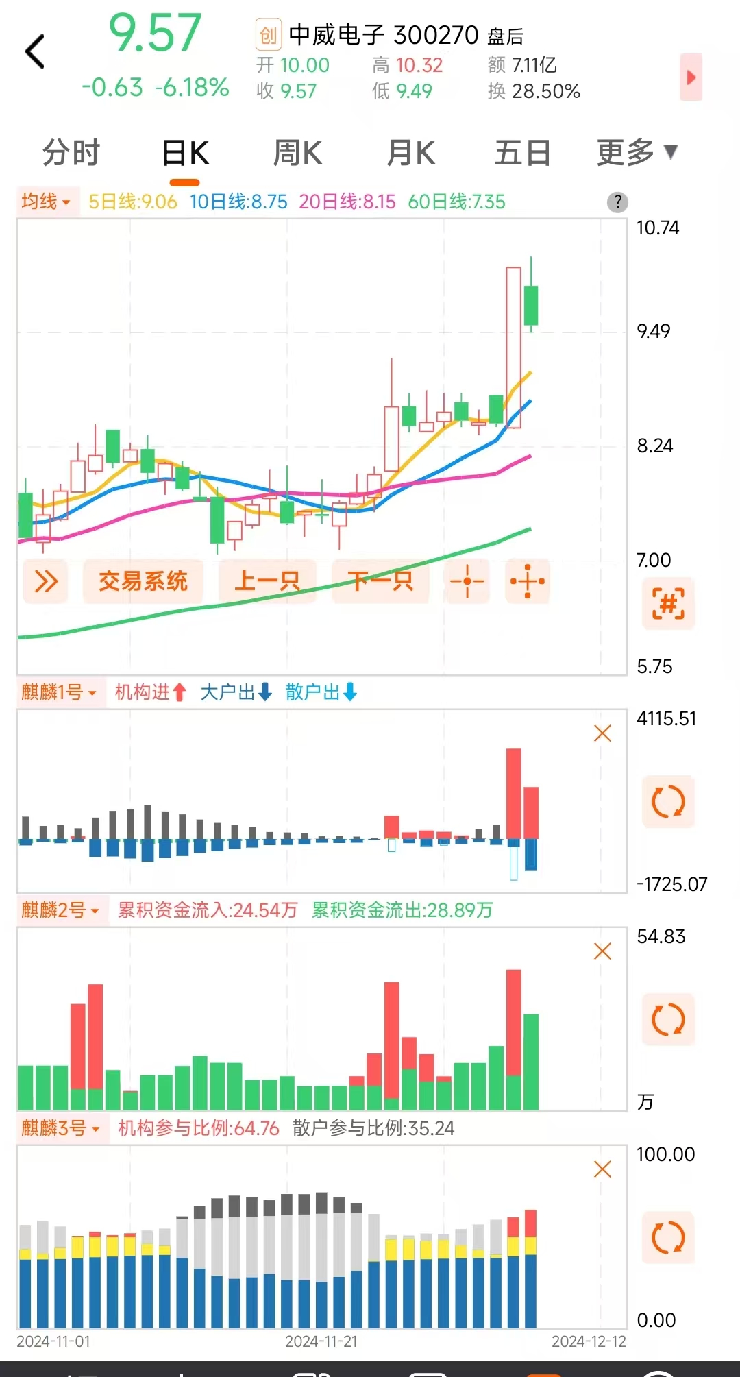 结合上麒麟指标结合上麒麟1号翻红多日,3号机构持仓比例不断增加也出现翻红,主力资金依旧强势,指标能辅助选出有主力资金参与的股票,增加我们的成功率。