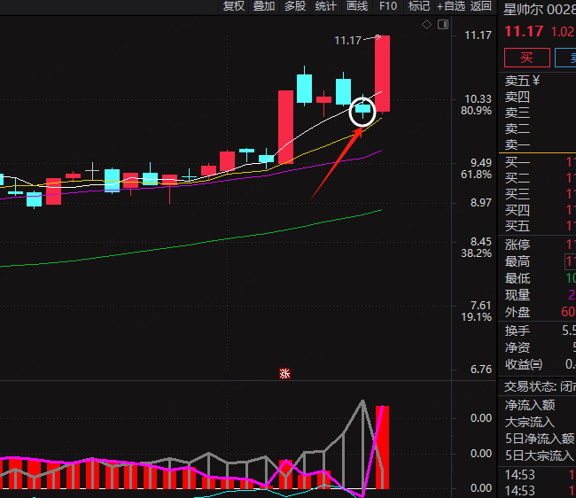 这种五绝后回踩5线,各种各样的走势,有三天内直接起涨的,也有三天后开始直接向下的。但大部分股票是处于横向震荡的状态,针对这些大部分股票,跌破5天线是一个很不错的博弈点,下方的10天线可以作为止损线,具有不错的盈亏比。如果大家看到有比较符合这种情形的个股,可以一起讨论。