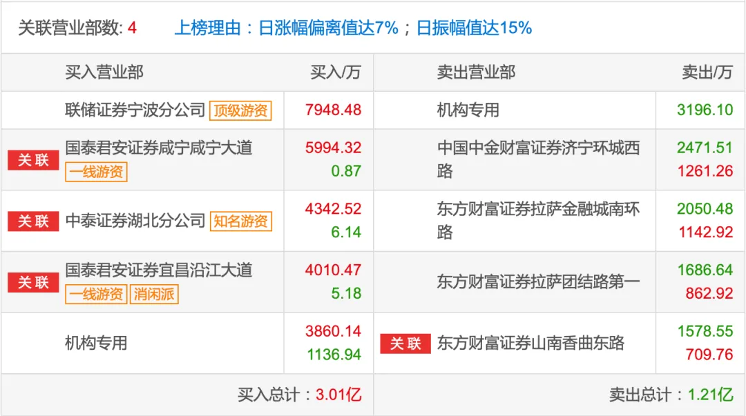 该股今天强势封涨停,炒作的是数据中心的电源设备,走出了一个准地天板的走势,龙虎榜显示顶级游资大幅买入近8000万,其余游资也是买的相对均匀一些,不过明天不太好接力,毕竟近期的个股持续性不太强,尤其是这种豪华榜,后面承接比较难。