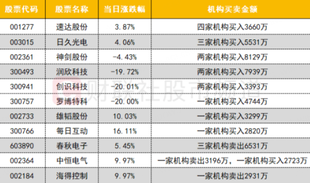 今日龙虎榜机构活跃度一般,买入方面,消费电子概念股日久光电获机构买入超5000万;神剑股份获机构买入超8000万;AI眼镜概念股润欣科技获机构买入超7000万;跌停的罗博特科获机构买入超4000万。