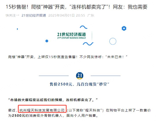最近,杭州程天科技发展有限公司(以下简称“程天科技”)在购物平台上架了一款售价为2500元的消费级外骨骼机器人,面向个人用户销售。
