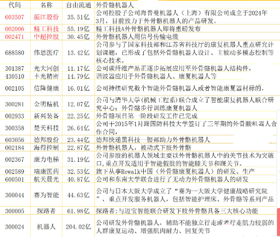 2. 振江股份 (603507):其子公司海普曼机器人(上海)有限公司致力于外骨骼机器人的智能控制算法及仿生学设计的研究,产品计划于2025年批量量产。