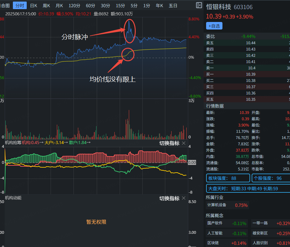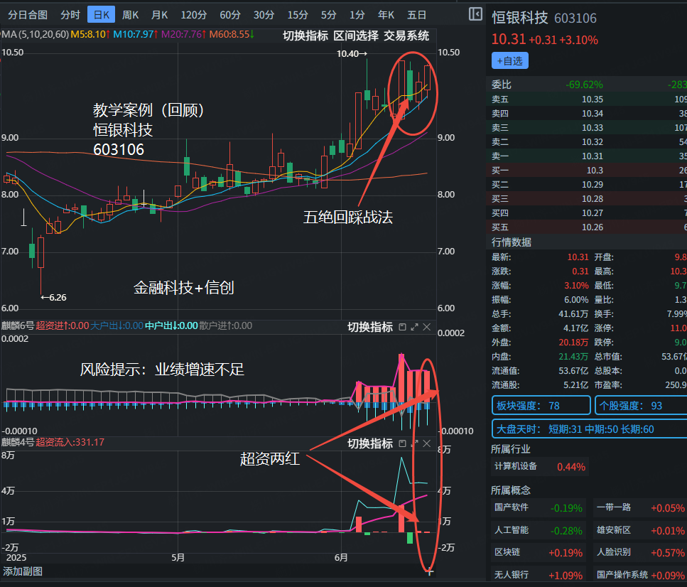 2025/6/17 17:03:41今天13.28分时,在社群里发了一只教学案例的股票。大家可以看一下是利用我们的五绝回踩战法选出的,K线上是五绝最强形态双剑合璧,指标上麒麟4,6号指标都是红色,形成超资两红状态。但我们看到下图,最近几根K线都在涨停K线内运行,说明这个五绝回踩形态不是特别的强势,最好是要在涨停板价位上方不破涨停价格为最佳。个股强度93说明这只标的还是非常活跃的。