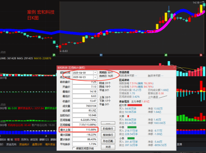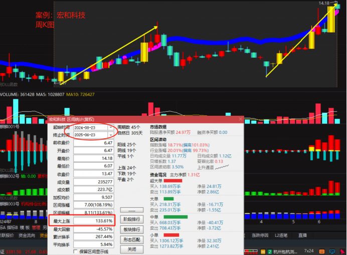 从个股的日K线图上看,股价在2025年4月9日探底回升,已经运行了50个交易日,期间最大涨幅超过1.3倍,其中5月29日和6月20日出现放量涨停突破麒麟趋势线,构成五绝形态,都满足麒麟123号3红,不足的是当日板块强度都低于60。