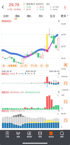 今天开盘,恒生电子也是大幅低开,跌破大阳线底部。但开盘后,股价快速拉升,截至收盘也是强势上涨6.35%。