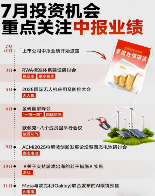 7月A股投资日历主要围着中报业绩、一堆行业会议和政策事件转。中报业绩就像“照妖镜”,要是超预期,能给个股和板块加把劲。另外,像数字货币、无人机、“一带一路”、能源油气这些板块,赶上对应的会议、政策推动,技术能突破、产业能拓展的话,就有投资机会。