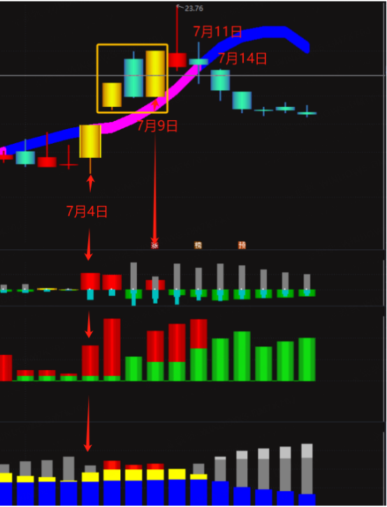另外,大阳底还讲究股价位置得安全。这么看的话,7 月 4 号的大阳线更符合要求,那天的大阳线上穿麒麟,还有麒麟 1 红 + 2 红 + 3 黄的配套,更像是趋势要启动的信号,所以后面才有 3 天 2 个涨停板。