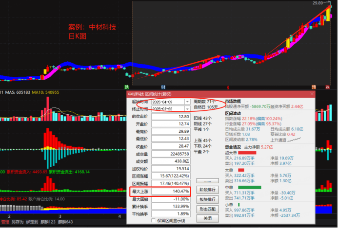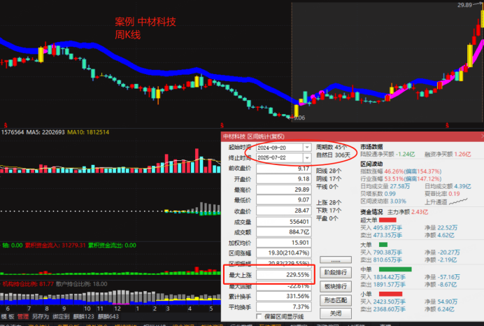 我们首先从周K线图上看,股价从2024年9月下旬以来,股价中期见底7.06后开启中期上升趋势最高到29.89,期间运作了45周,最大涨幅达230%;特别是最近4周股价开始进入加速上行,通常加速之后就容易出现波段顶部,股谚:百日底,三日顶。因此短期需要提防股价进入无限风光在险峰阶段。