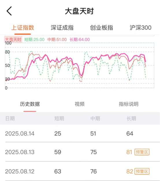 今天天时指标“降温”明显。短期线从 59 分一下跌到 25 分,中期线也从 75 分滑到 51 分,长期线虽说跌得慢点,可也从 81 分降到 64 分了。更关键的是,中期线还跑在长期线下面,仍是震荡回落的迹象。