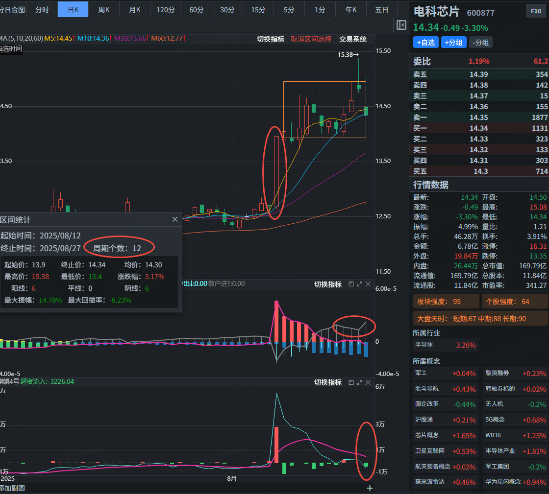 公司在军工集成电路领域市占率约 12%,排名第三,技术壁垒显著,北斗短报文 SoC 芯片已应用于多家手机厂商终端。依托央企背景,公司持续布局低空经济、商业航天、智能网联汽车等新兴领域,并与普华基础软件合作开发汽车电子解决方案。风险层面,全球半导体行业周期下行、消费电子需求疲软及应收账款回款压力仍存。截至 2025 年 8 月,公司总市值约 169.79 亿元,市盈率(TTM)274.73 倍。可以看到这只股票叠加了当下热门的两大题材军工和芯片,但整体业绩一般,并没有太突出的亮点。