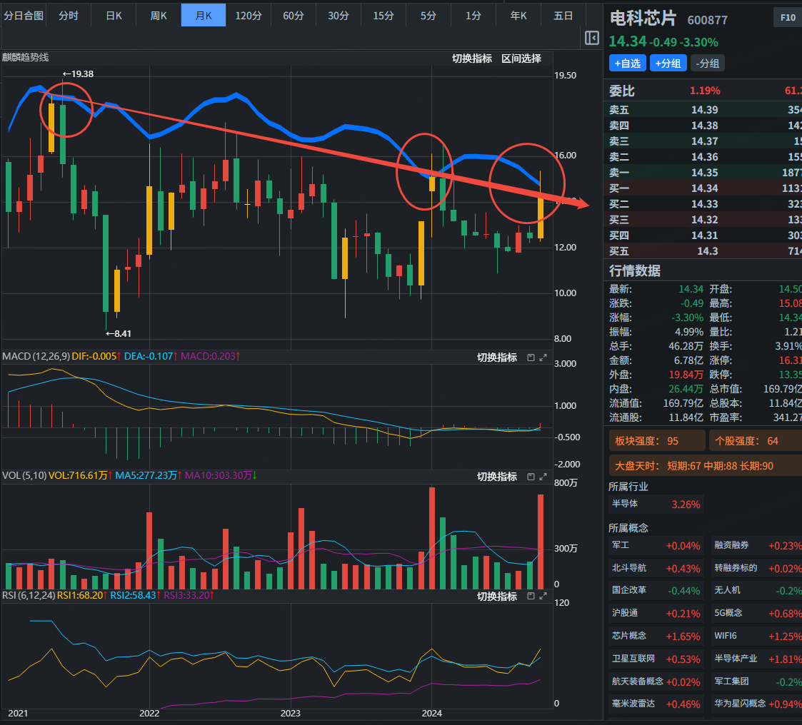 如图所示:整体股价一直在麒麟月线下方运行,可以看图中画圈的位置,股价每次上穿麒麟月线都被压下来,说明趋势的压力很重。图中的斜线也很好的表明了下降趋势通道,所以我们选股要尽量选麒麟月线上方,趋势向上的标的。或者是月麒麟线和日麒麟线一起向上突破的日月共振形态,这样才更具有爆发力。
