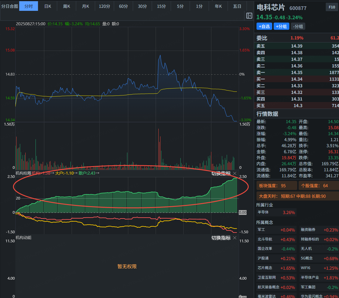 可以看到机构抢筹的指标全天都是绿色为主,这种状态说明散户资金在流入而大户及机构资金都是流出的,所以我们选标的时候也要都注意一下,尽量选机构抢筹是红色状态的,机构资金流入的标的。这样从多个维度去筛选标的,第一会增加我们的成功概率,更会缩小我们标的的选择范围,很多标的只需要看一两个指标就能直接排除在外了。所以大家还需要更加熟悉我们的指标和战法,才能在实战中更好的选出交易目标。