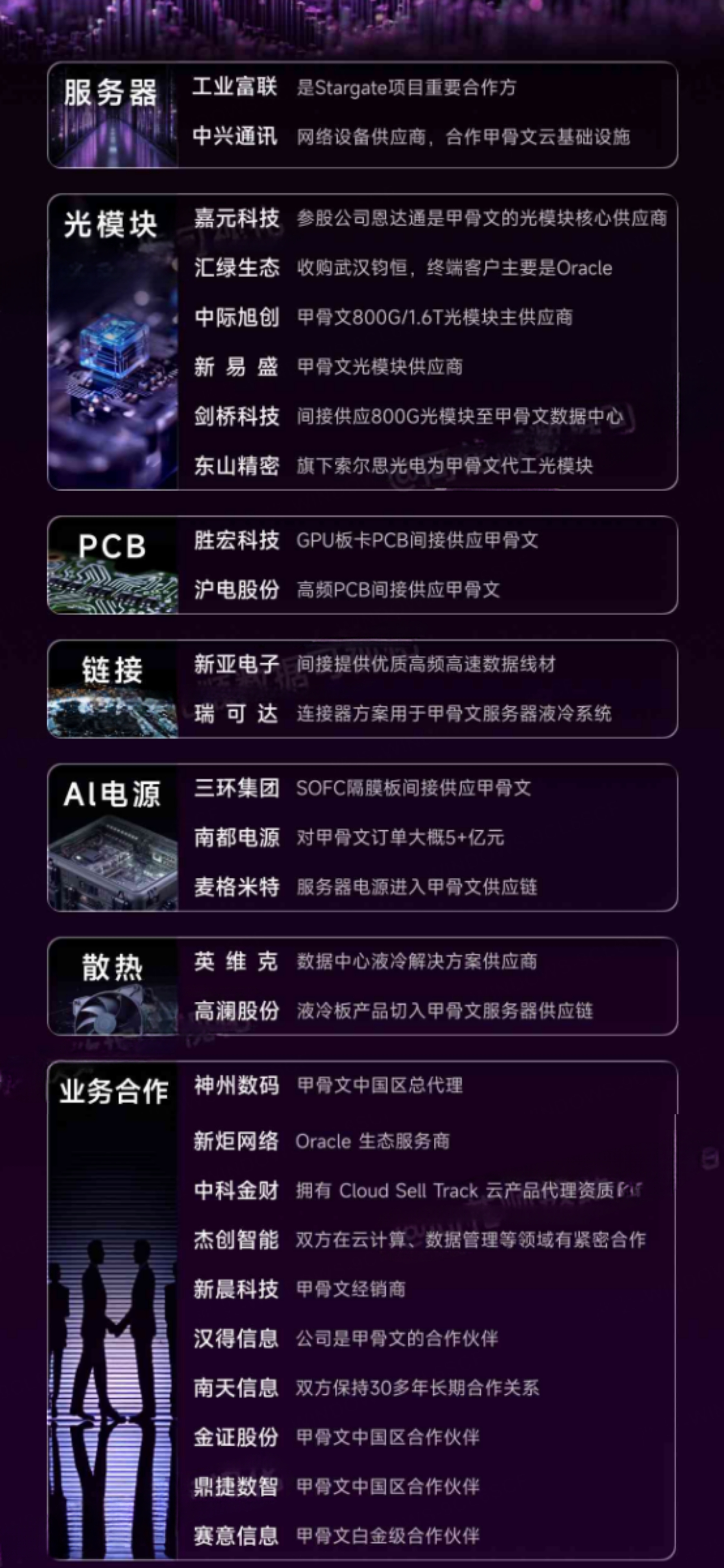 这是最直接受益的板块,光模块、服务器、PCB组成“铁三角”。高速率光模块要适配数据中心之间的互联需求,订单肯定涨;AI服务器的代工订单已经很明显在增加;还有高端PCB,因为要适配高功率芯片,用得越来越多——这三类都能直接接到甲骨文的硬件采购单。