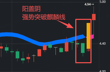 涨停阳线完全覆盖前日阴线开盘价,且站上麒麟线之上,主力通过阴线洗盘后快速反包,消化短期抛压。
