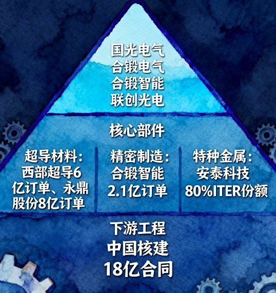 核聚变产业链像 “金字塔”,上游材料和中游核心部件最赚钱,优先选技术硬、订单稳的龙头: