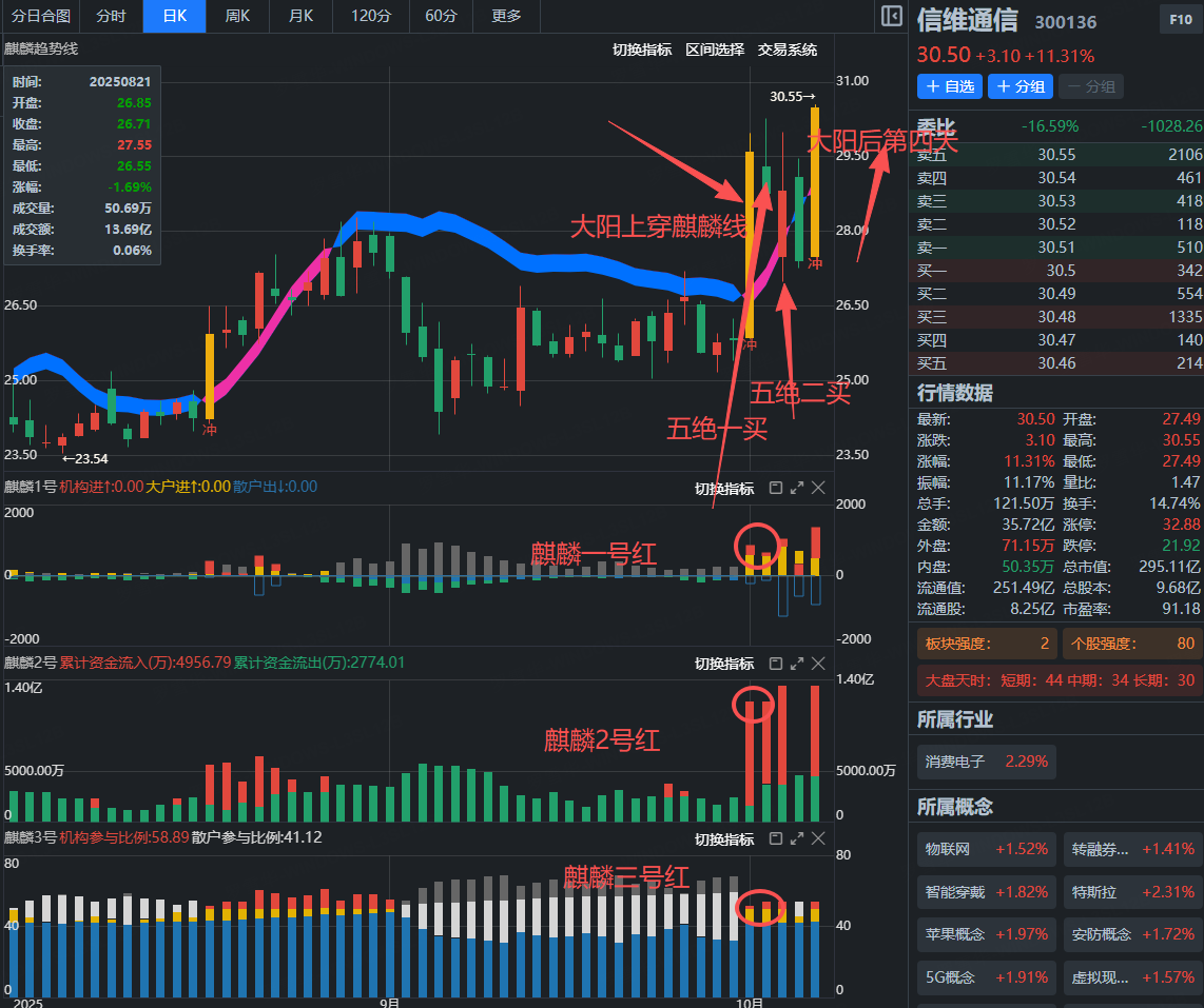 信维通信经过几个月的行盘震荡后,在10月9日大阳上穿麒麟线,形成五绝形态。