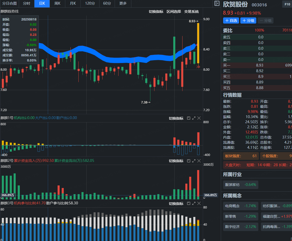 该股经过两个月横盘震荡之后,今日日线再次低位大阳穿麒,个股强度96,结合上麒麟指标1号主力牢牢控盘,机构首控,3号目前机构持仓比例不断增加,结合战法规则,明天我们通过盘中确认功能结合个股强度,寻找合适参与机会。