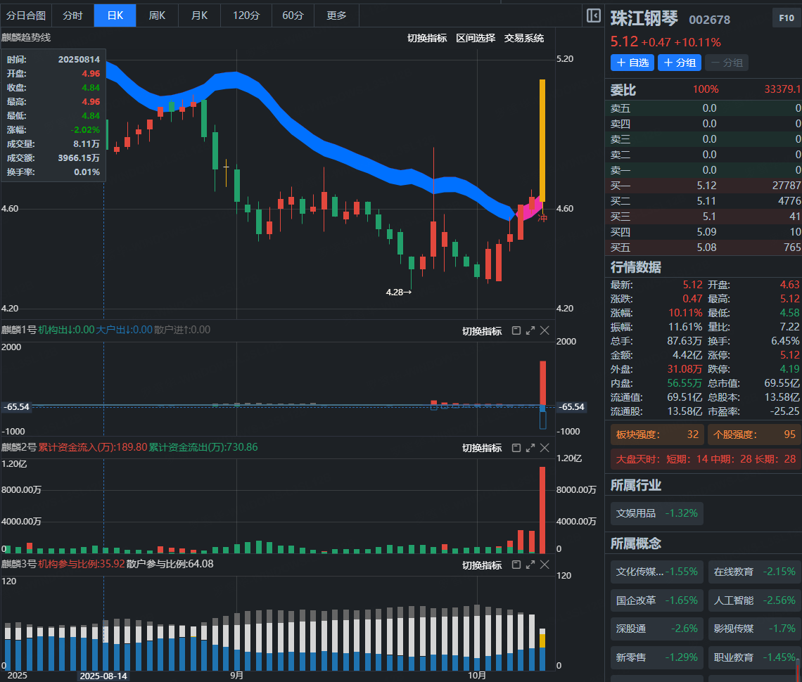 该股经过两个多月横盘震荡之后,今日日线低位大阳穿麒麟,个股强度96,结合上麒麟指标1号主力牢牢控盘,2号资金净流入,3号目前机构持仓比例不断增加,结合战法规则,明天我们通过盘中确认功能结合个股强度,寻找合适参与机会。