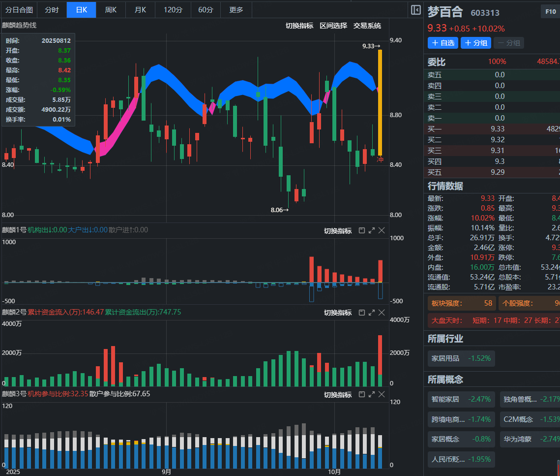 该股经过一个多月横盘震荡之后,今日日线低位大阳穿麒麟,个股强度97,板块强度91,结合上麒麟指标1号主力牢牢控盘,2号资金净流入,3号目前机构持仓比例不断增加,控盘度有所增加,结合战法规则,明天我们通过盘中确认功能结合个股强度,寻找合适参与机会。