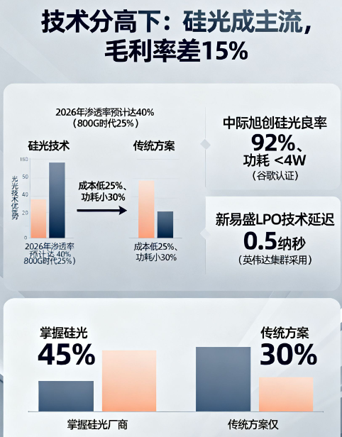 1.6T时代,“硅光技术”成了分水岭。这技术能把电子和光子器件集成在一块芯片上,成本低、功耗小,2026年渗透率预计达40%,比800G时代高15个百分点。
