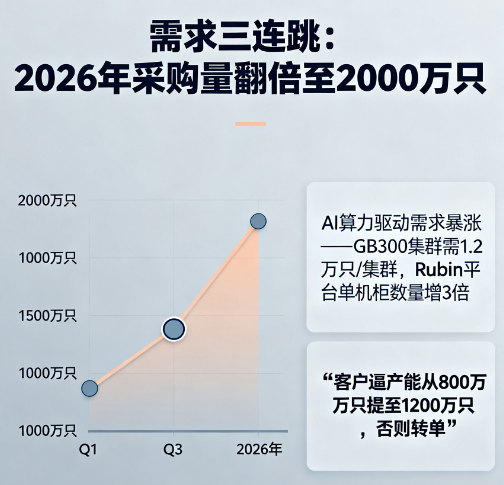 1.6T光模块正迎来“卖爆”时刻——海外大客户2026年的采购计划从年初1000万只直接翻到2000万只,两年需求翻倍的预期下,行业已经出现产能缺口。这波爆发全靠AI算力“催单”:GB300、Rubin这些新算力平台一上,数据中心带宽需求呈指数级涨,1.6T光模块成了“刚需”。