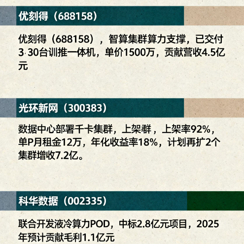 • 协鑫能科(002015):间接持股0.5%,给沐曦智算中心做储能,PUE降到1.08,年化收益15%;计划共建10个“绿电+算力”中心。