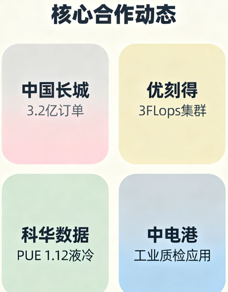 10月以来,沐曦接连官宣重磅合作,实打实证明了商业化能力:和中国长城联合搞出AI服务器整机,适配政务算力;给优刻得的千卡智算集群供GPU,单机柜算力密度达3PFlops;跟科华数据合作液冷算力POD,PUE低到1.12(越接近1越节能);通过中电港渠道,把芯片卖到工业质检场景规模化应用。政务、互联网、工业全覆盖,销路彻底打开了。