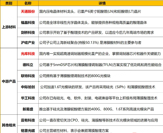 国内企业已构建完整产业链:材料端(天通股份、福晶科技)→芯片端(光库科技、德科立)→模块端(中际旭创、新易盛)。