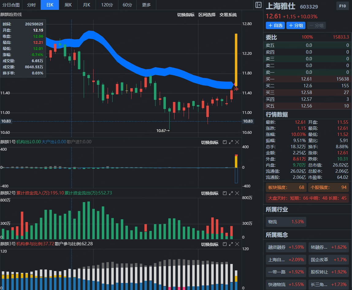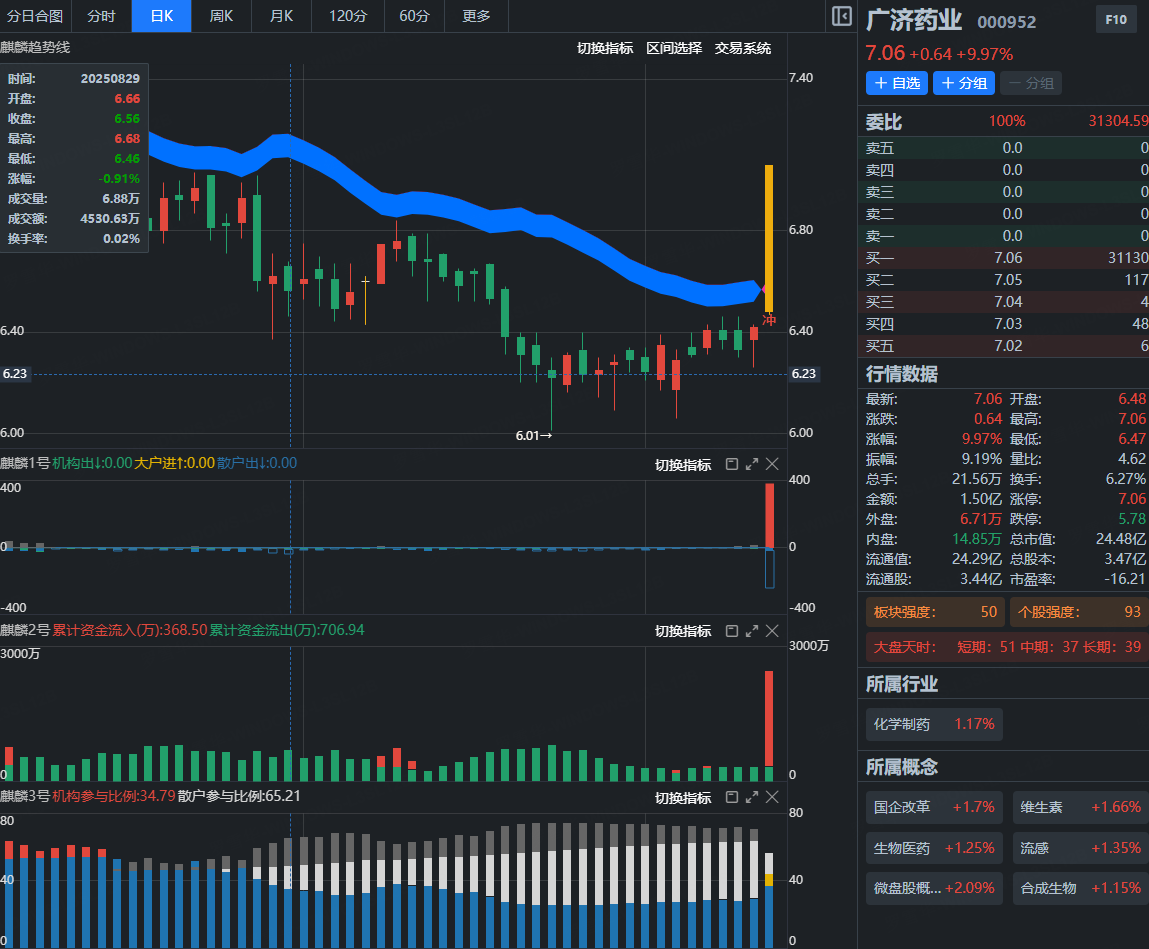 该股经过横盘2个多月震荡之后,今日日线再次上穿麒麟线,个股强度93,结合上麒麟指标1号主力牢牢控盘,2号资金净流入,3号目前机构持仓比例不断增加,结合战法规则,明天我们通过盘中确认功能结合个股强度,寻找合适参与机会。