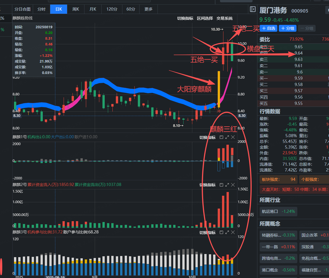 厦门港务经过几个月的行盘震荡后,在10月17日大阳上穿麒麟线,形成五绝形态。