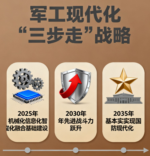 2. 军工现代化"三步走"战略:
