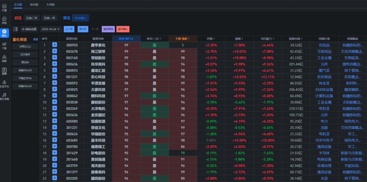 从AI量化给的数据来看,由于今天市场是高开高走,单边放量震荡走强,很多股票也都是高开高走,则今天少了很多低吸的机会,因为咱们五绝战法以低吸为主,因此整体今天模式的赚钱效应只是表现较好。从赚钱效应好的行业方向来看,今天主要是集中在半导体、通用设备方向,由于市场风格的变化,今天赚钱好的方面与昨天相比明显发生了很大变化。从量能来看,今天大幅放量3309亿元,