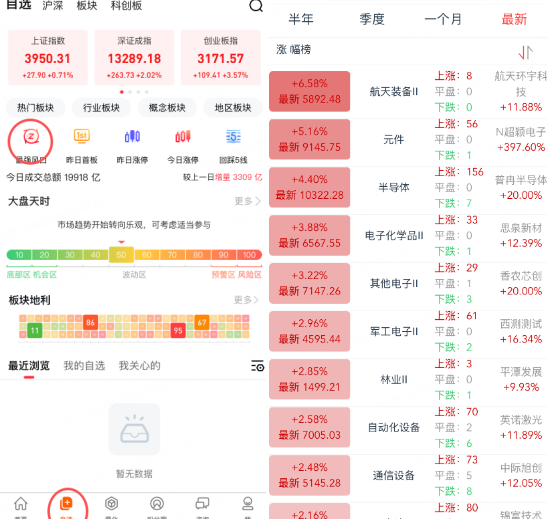 在APP,找到【自选】界面,找到【最强风口】,可以看到当日热点板块以及强度。