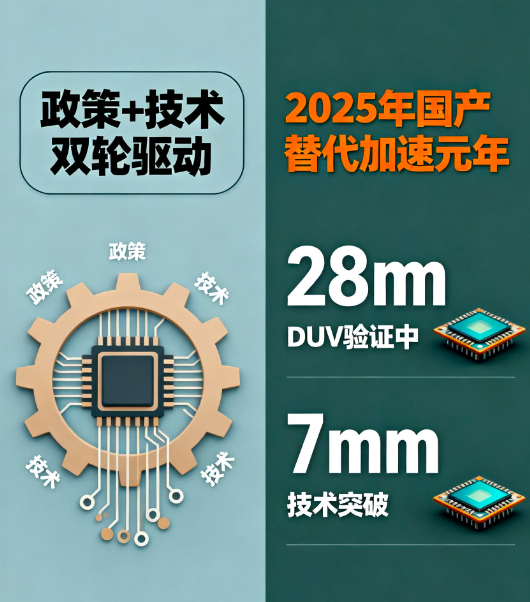 当前国内已在光刻胶、光学元件等核心环节实现从 “0 到 1” 的跨越,28nm DUV 光刻机进入验证阶段,7nm 及以下先进制程支撑技术取得突破,2025 年有望成为国产替代 “加速元年”。