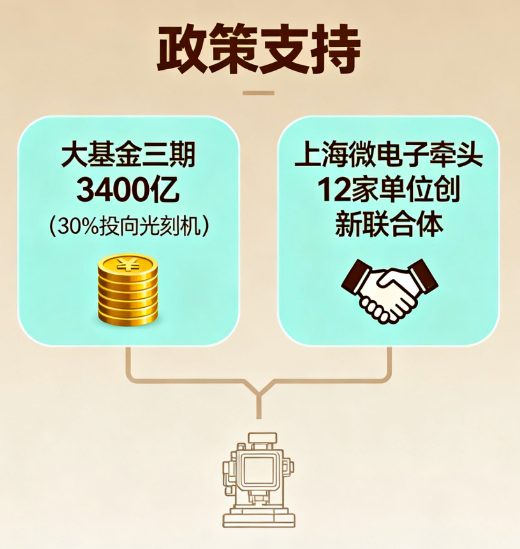 资金端:大基金三期 3400 亿元专项额度中,30% 投向光刻机及配套材料,北方华创、中微公司等设备商已获首批注资;