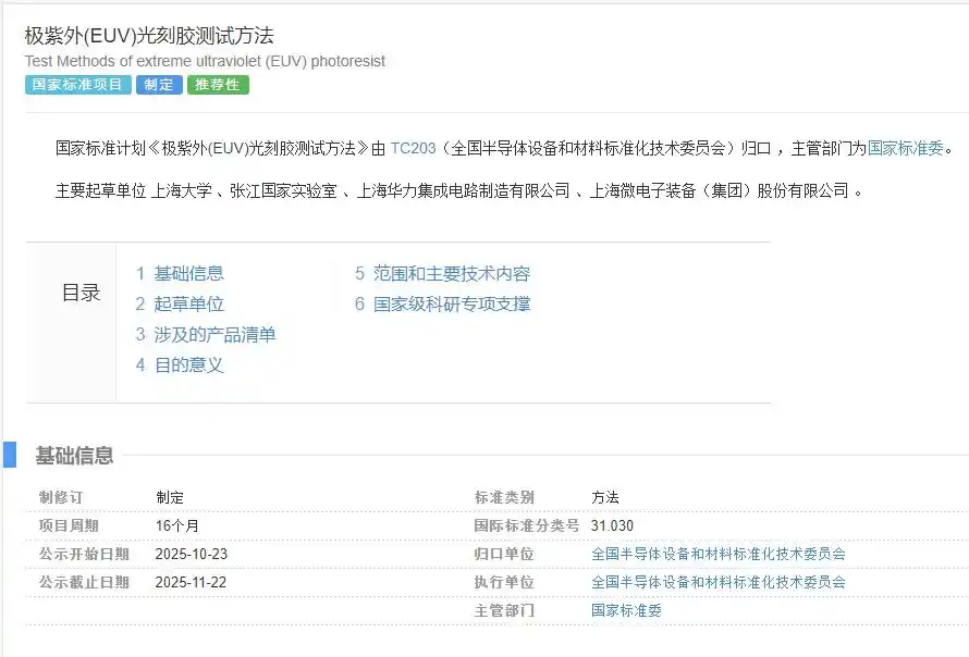 国家标准委 10 月 23 日公示的《极紫外(EUV)光刻胶测试方法》,是我国首个针对 EUV 光刻胶的技术标准。该标准由上海大学、张江国家实验室等单位联合起草,将建立统一的性能评价体系,三大目标直接利好产业落地: