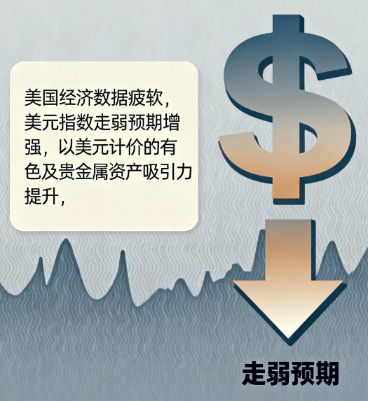 美联储降息预期强化下,美元指数面临下行压力。历史数据显示,美元走弱通常拉动以美元计价的有色、贵金属价格 —— 投资者增配相关资产以对冲美元贬值风险,进一步放大行情。