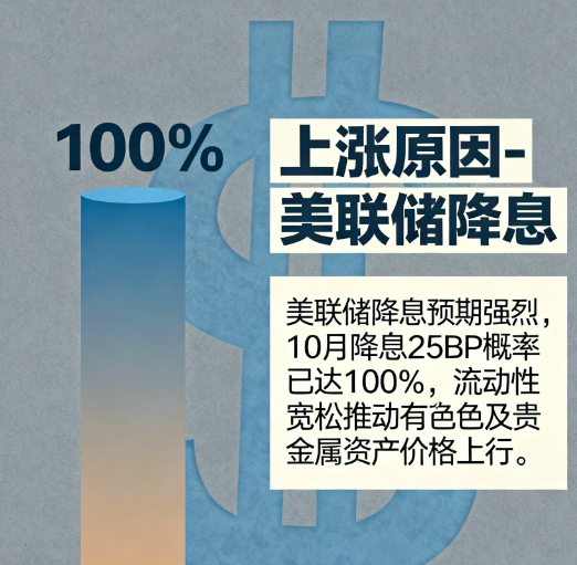 美国 9 月失业率升至 4.3%(近一年新高),就业市场疲软;尽管核心 PCE 略有回升,但鲍威尔明确 “关税对通胀影响为一次性”,长期通胀预期稳定。市场对 10 月降息 25 个基点预期概率达 100%,直接压低实际利率,推动美元指数走弱,为有色及贵金属提供上涨动能。