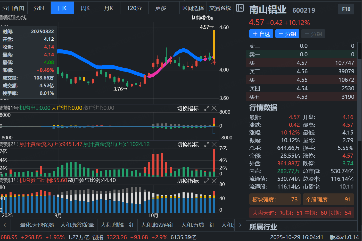 盘后预选结合天时,趋势,形态,指标,以及板块和个股强度来进行多维对比选择,能辅助选出有主力资金参与的股票,增加我们的成功率 指标能辅助选出有主力资金参与的股票,增加我们的成功率。但是需要明天结合AI 量化盘中确认功能结合个股强调进行甄别选择。