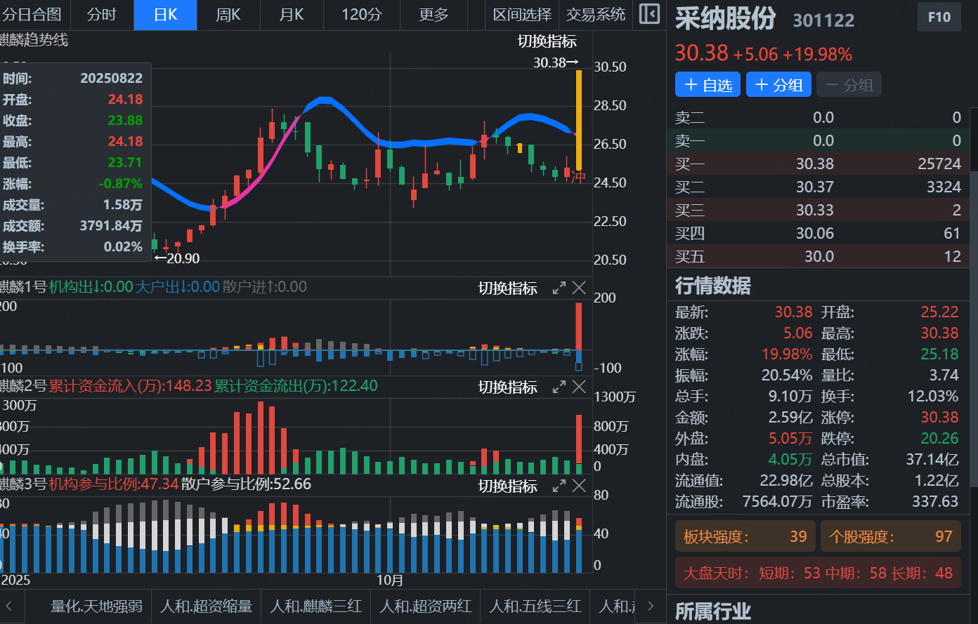 该股经过一个多月横盘震荡之后,今日日线低位大阳穿麒麟,个股强度97,结合上麒麟指标1号主力牢牢控盘,2号资金净流入,3号目前机构持仓比例不断增加,控盘度有所增加,结合战法规则,明天我们通过盘中确认功能结合个股强度,寻找合适参与机会。