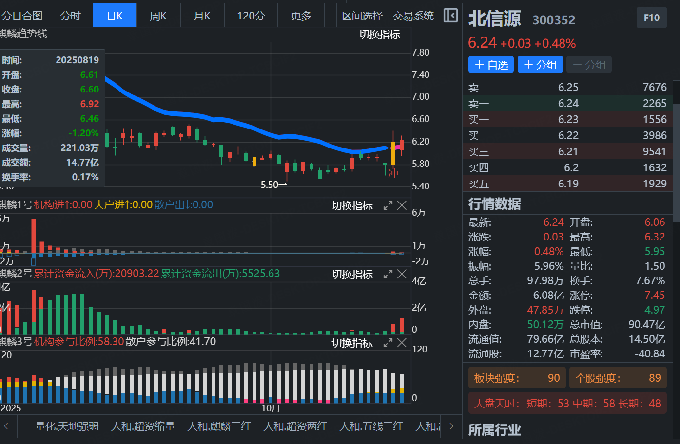 该股经过两个月横盘震荡之后,今日日线再次低位大阳穿麒,个股强度89,结合上麒麟指标1号主力牢牢控盘,2号资金净流入,3号目前机构持仓比例不断增加,结合战法规则,明天我们通过盘中确认功能结合个股强度,寻找合适参与机会。