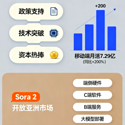 移动端月活用户突破 7.29 亿(同比 + 200%),Sora 2 开放亚洲市场验证全球化需求,机构明确 “端侧硬件、C 端软件、B 端服务、大模型部署” 四大投资主线。