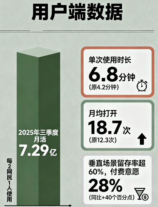 第三方机构 QuestMobile 数据显示,2025 年三季度国内 AI 应用移动端月活达 7.29 亿,每两个网民中就有一人使用 AI 应用,标志行业进入规模化普及阶段。