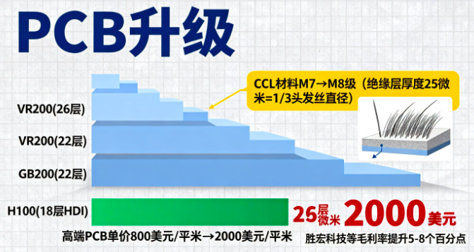 AI服务器正在掀起PCB的"层数军备竞赛"!从H100时代的18层HDI,到GB200的22层,再到VR200预计的26层,PCB的技术壁垒持续抬高。