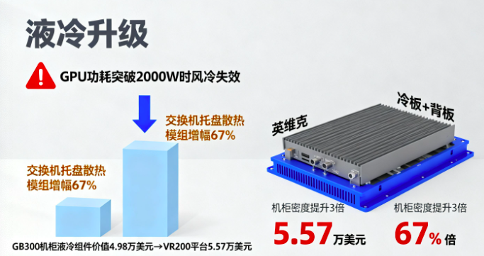 液冷技术正在改写服务器的性能边界!当GPU功耗突破2000W时,风冷系统的散热效率已触达物理极限。大摩数据显示,GB300机柜的液冷组件价值达4.98万美元,到VR200平台将增至5.57万美元,其中交换机托盘散热模组价值增幅高达67%。英维克等厂商提供的"冷板+背板"一体化方案,不仅解决了散热问题,还使机柜密度提升至原来的3倍。
