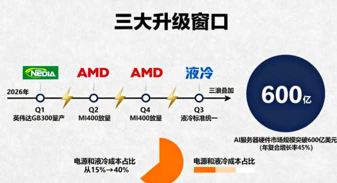 2026年将出现罕见的"三浪叠加":英伟达GB300平台量产(Q1)、AMD MI400系列放量(Q2)、液冷标准统一(Q3)。