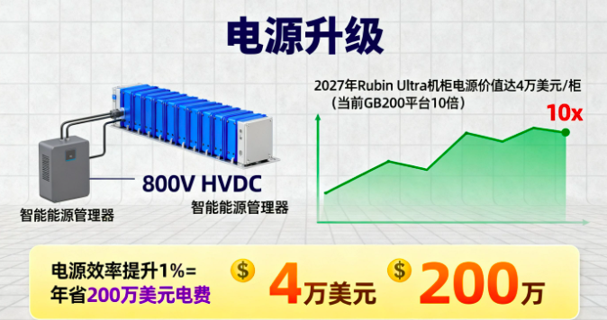 大摩预测,到2027年Rubin Ultra机柜的电源解决方案价值将达4万美元/柜,是当前GB200平台的10倍。更重要的是,电源效率每提升1%,就能为数据中心每年节省200万美元电费,这种"降本即增收"的逻辑让电源厂商掌握了定价权。