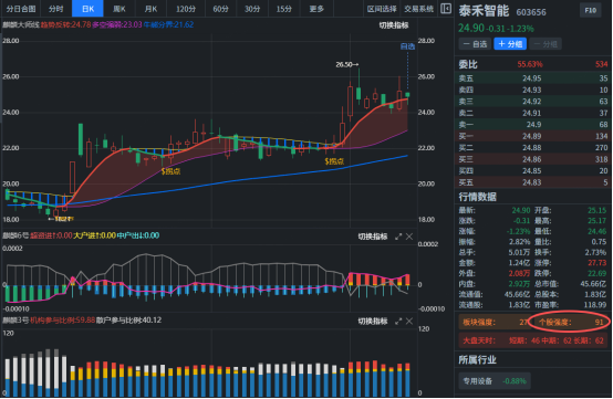 该股股价自从9月4日创波段低点18.22以来,开始中期震荡向上行情,期间有2个向上拐点K线形态,短期创阶段新高后有震荡调整,实现三期共振向上;板块强度27而个股强度91;结合麒麟指标6号持续红柱,表明主力资金实现高度控盘,3号持续红柱,显示机构持仓比例超过5成;结合战法规则,短期我们可考虑回踩靠近红线,通过盘中确认功能结合个股强度,寻找合适参与机会。