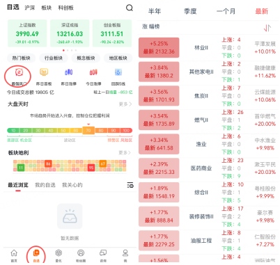 在APP,找到【自选】界面,找到【最强风口】,可以看到当日热点板块以及强度。
