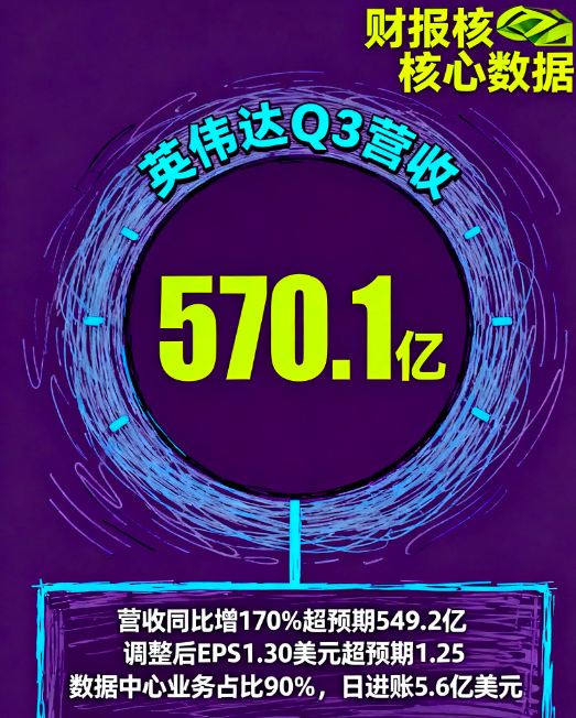 美东时间11月20日盘后,英伟达交出了一份让华尔街瞠目结舌的成绩单:Q3营收570.1亿美元,同比激增170%,远超市场预期的549.2亿美元;调整后每股收益1.30美元,同样碾压分析师预期的1.25美元。其中数据中心业务营收512亿美元,同比暴增204%,占总营收比重高达90%,相当于每天进账5.6亿美元!